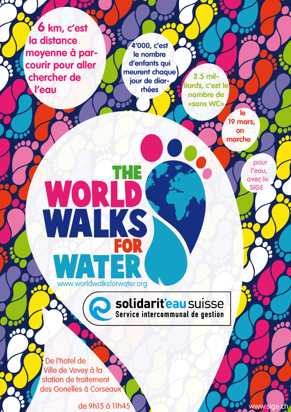 Des élus du SIGE, le directeur exécutif et des collaborateurs du SIGE ainsi que des habitants des communes du SIGE et leurs familles ont marché ensemble un chemin de 7 km (de l’Hôtel de Ville de Vevey à la station de traitement d’eau des Gonelles, à Corseaux, et retour) pour marquer leur solidarité avec le 10% de la population mondiale environ qui doit parcourir en moyenne 6 km par jour pour trouver de l’eau.