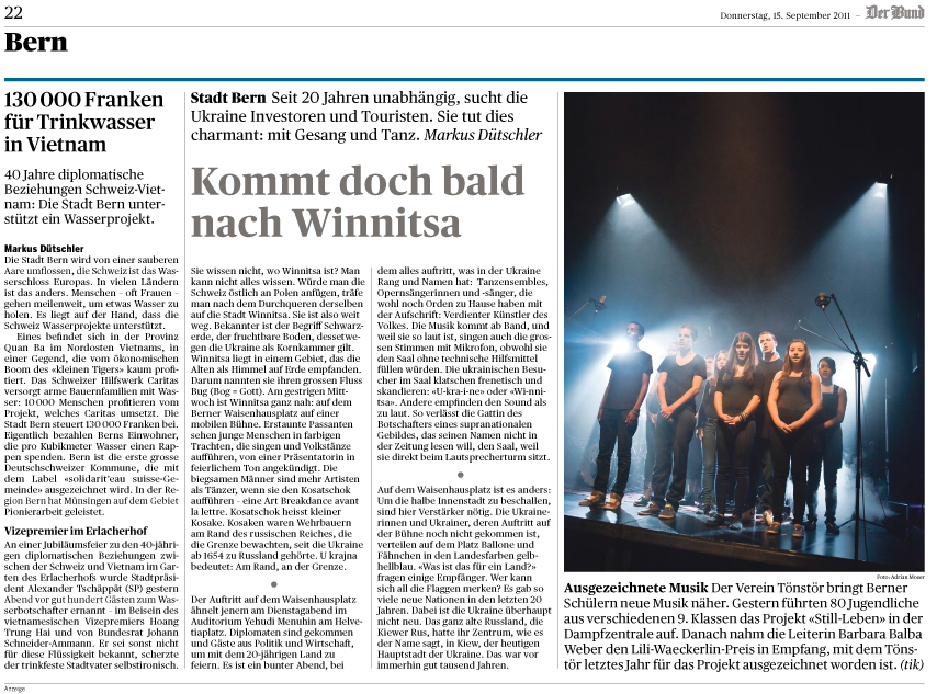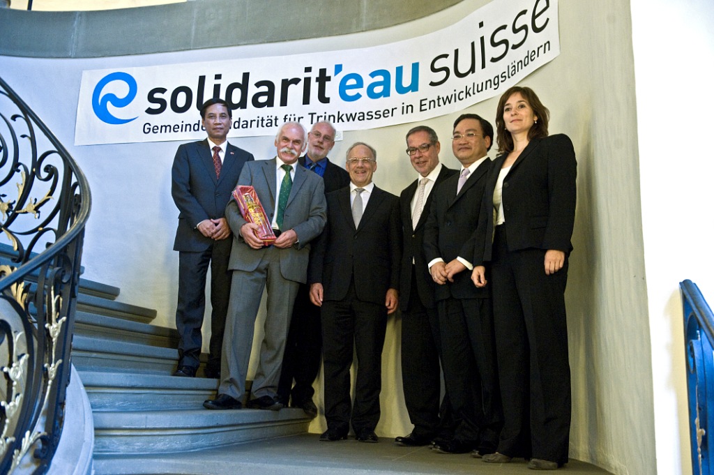 Berns Stadtpräsident Alexander Tschäppät überreicht dem vietnamesischen Vize-Premierminister Hoang Trung Hai diesen Wasser-Solidaritäts-Beitrag persönlich. Er tut dies im Rahmen der offiziellen Feier des 40jährigen Jahrestages der diplomatischen Beziehungen zwischen der Schweiz und Vietnam. Gleichzeitig verleiht „solidarit’eau suisse“ der Stadt Bern das Label „solidarit’eau suisse-Gemeinde“ und dem Stadtpräsidenten den Ehrentitel "Botschafter solidarit'eau suisse".