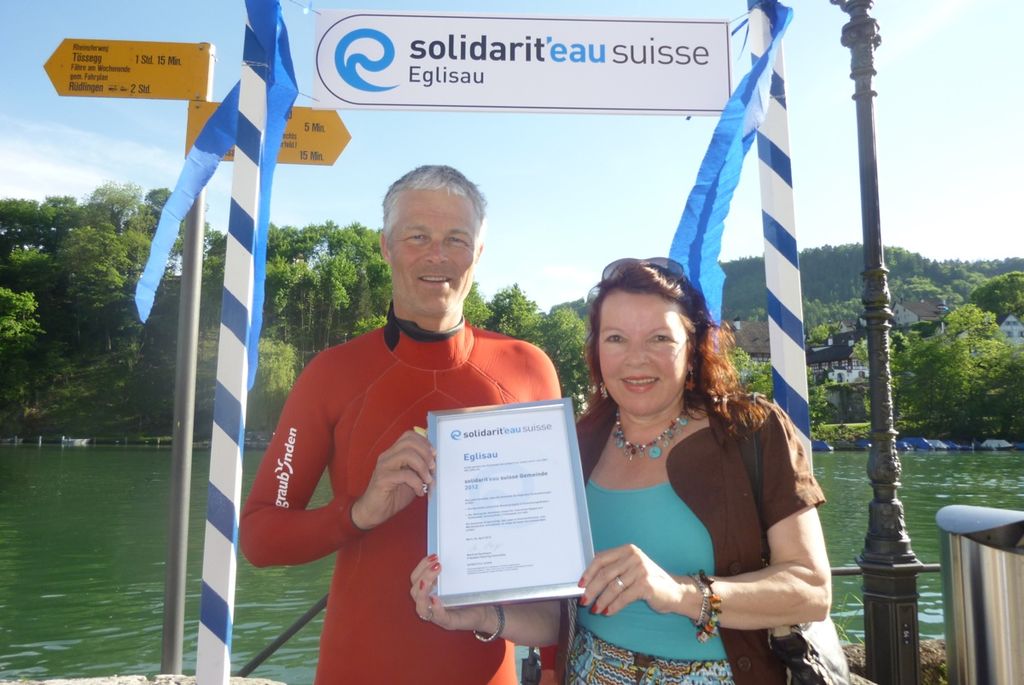 Bromeis will mit seiner Aktion auf die begrenzte und kostbare Ressource Wasser aufmerksam machen. Auf seiner Wasser-Reise wird er diverse Schweizer Gemeinden anschwimmen. Als Botschafter von „solidarit’eau suisse“ überreichte er diesen Freitag der Gemeinde von Eglisau das Label „solidarit’eau suisse-Gemeinde“.