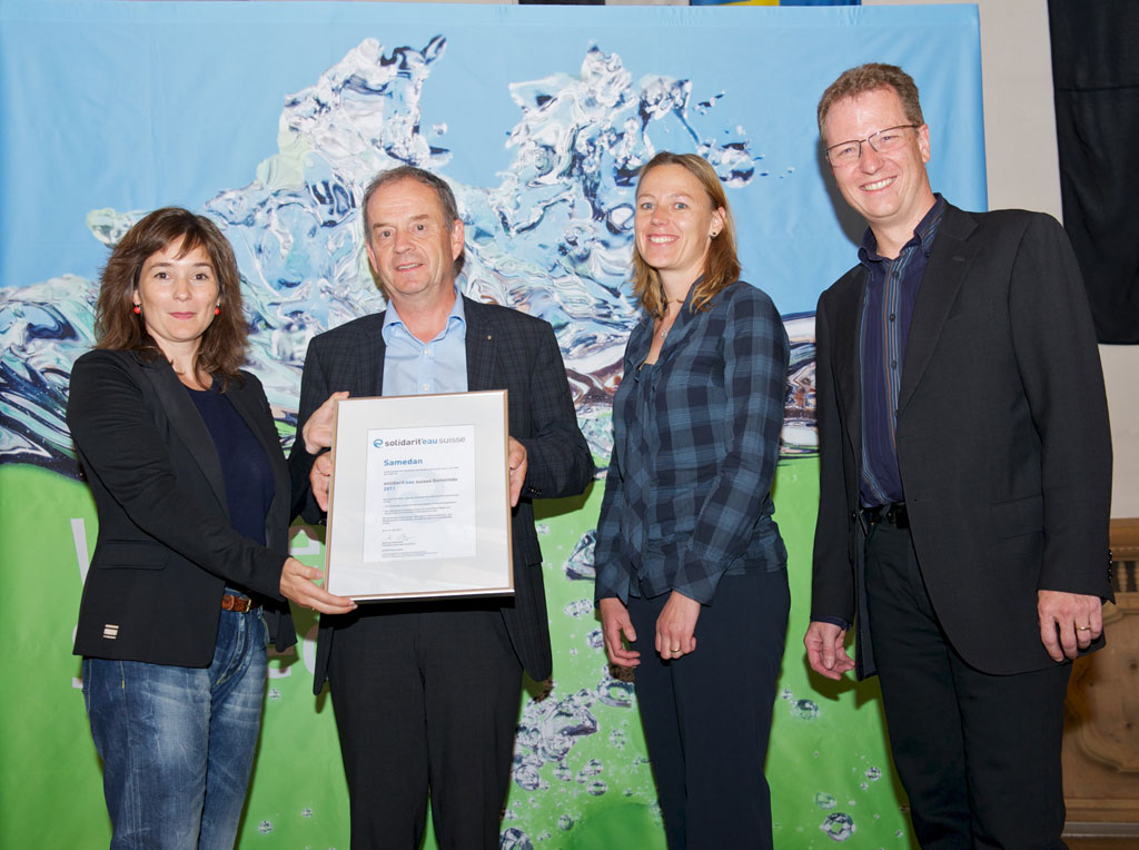 Übergabe des Labels "solidarit'eau suisse-Gemeinde" an den Wasssertagen in Samedan. V.l.n.r. Monika Trost, solidarit'eau suisse; Thomas Nievergelt, Gemeindepräsident von Samedan; Alice Bisaz, Projektleiterin "Wassertage Samedan"; Patrick Blarer, Gemeindevorstand